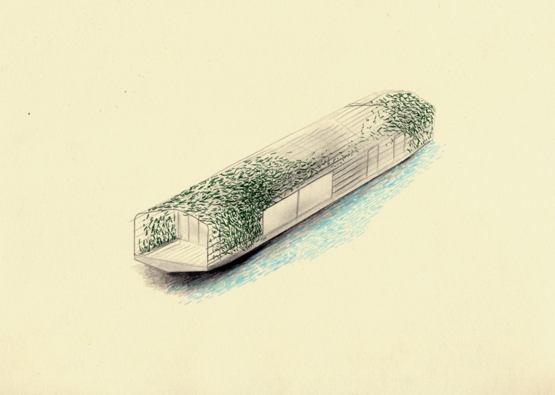 lcove laid onto the rectangular platform of the boat (23mx5m). In a global surface of 110m2 (with 23m2 of terraces), life and work are articulated around different spaces, neither defined nor definitive. Large flower pots placed on the terraces are the starting points of creepers that should invade the walls and roof. In the next future, plants will recover the whole, thus integrating the building within the landscape of the shores and providing further intimacy to the residents.