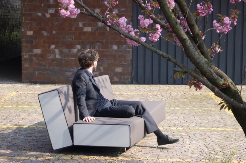 With the Pol Sofa, the aim was to create a simple, economic, yet comfortable sofa. By reducing the usual components of the archetype (armrests, cushions etc.), a sort of straight synthesis has been reached with delicacy. The sofa is composed of two absolutely similar elements that form the seat and the back. Each element is made of a foam block encased in a fabric tube, while each end is closed by a plastic piece without any overstitching. A light metallic structure lifts the two masses off the