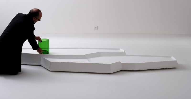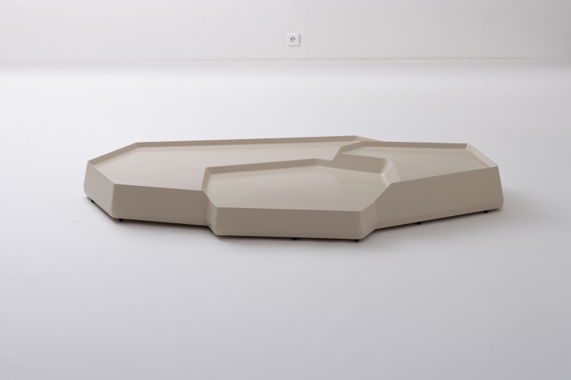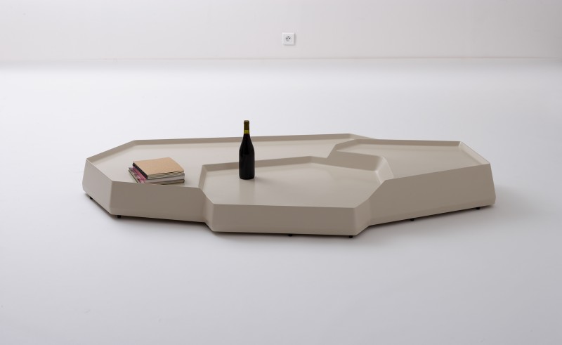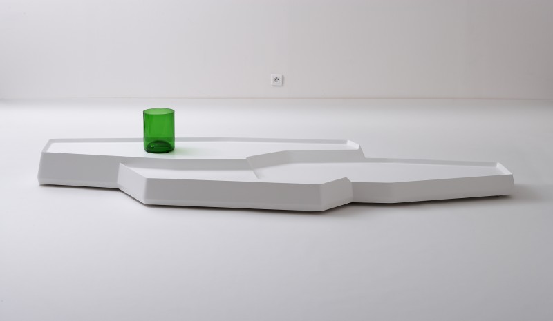 The moulded polyester tables, with their synthetic appearance, are huge monolithic shapes that are barely off the ground. Their white and unreal aspect makes them seem like floating ice floes.
