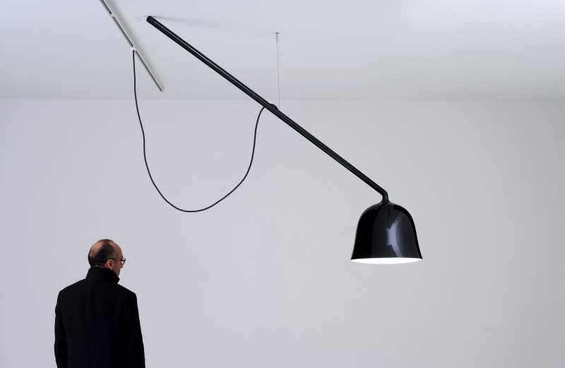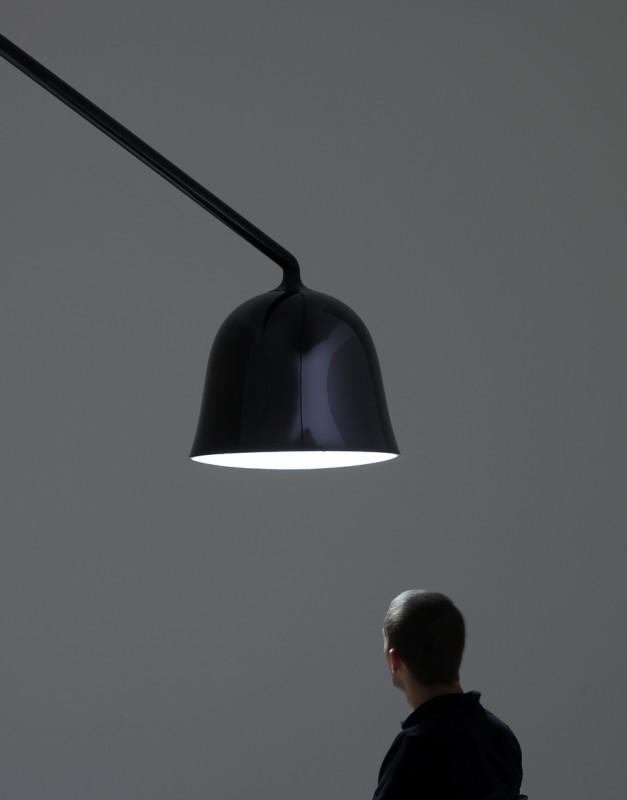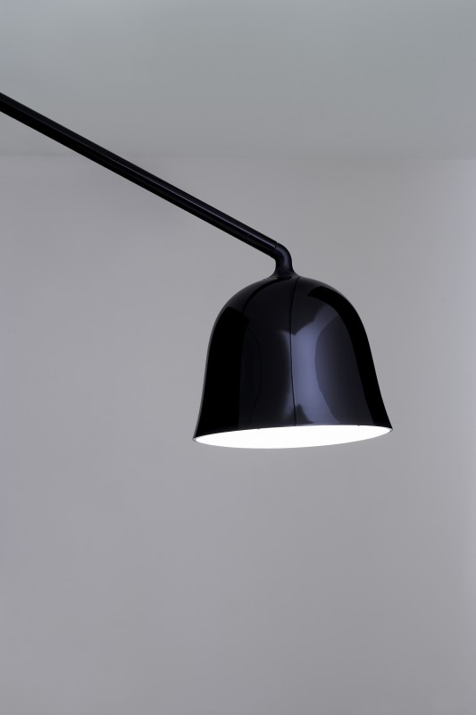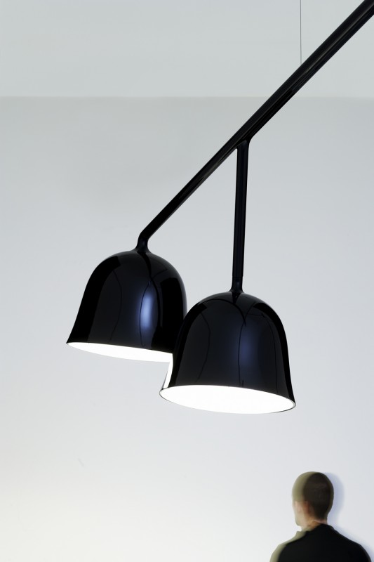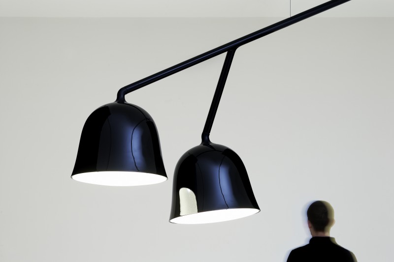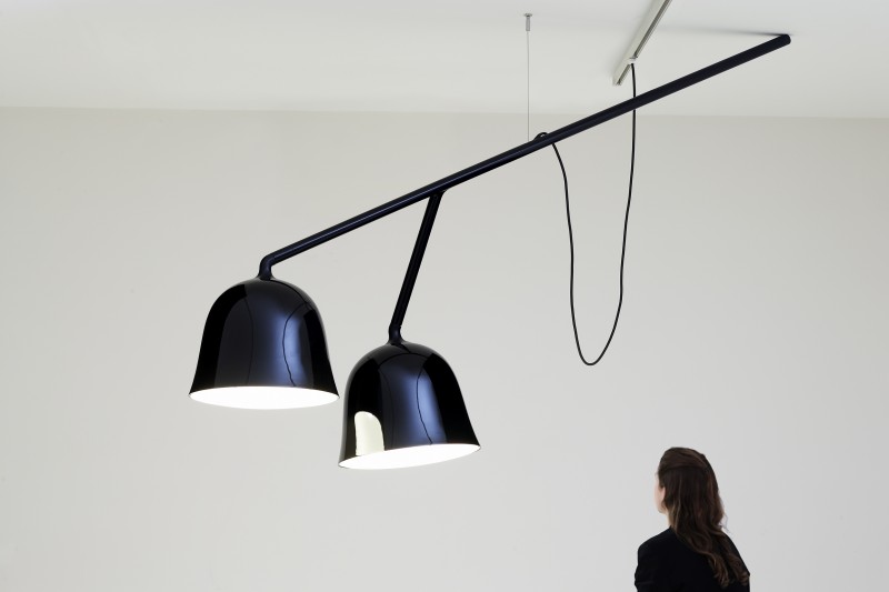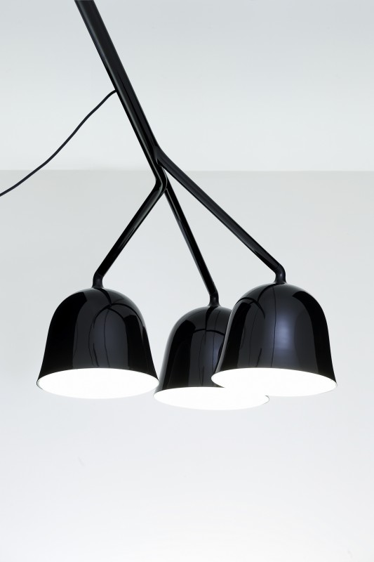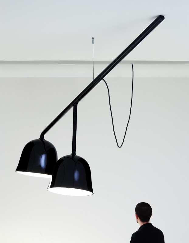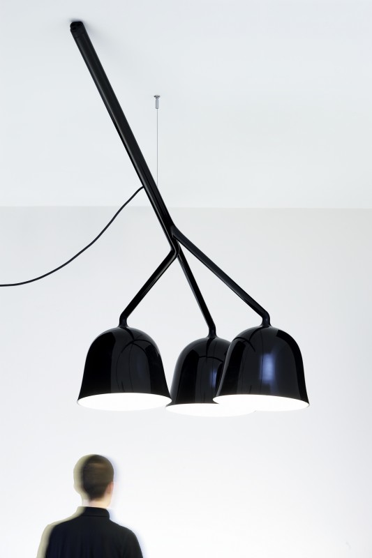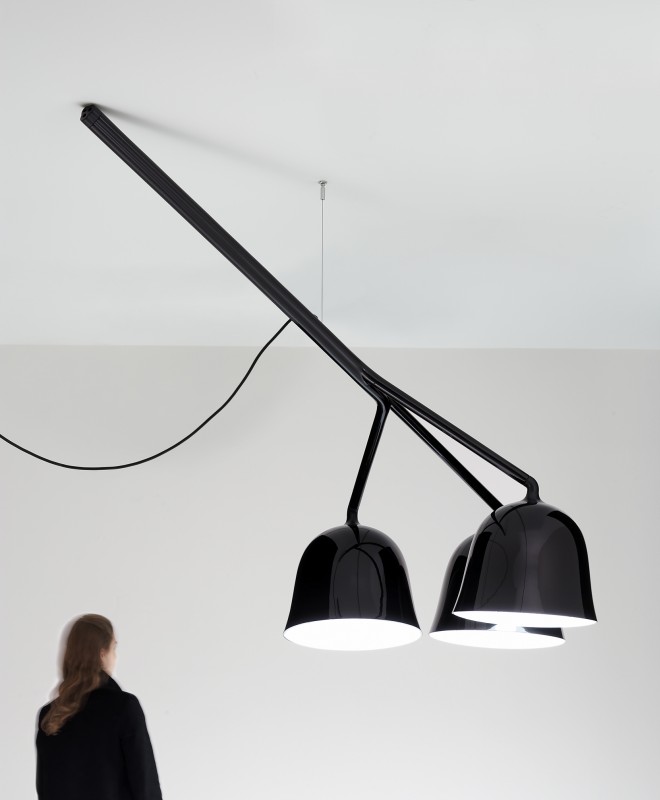 The disturbing, long black lamp, invents a pivoting principle that leans on the ceiling. It moves like a living organism, like a three-headed hydra. The exaggerated diameter evokes the imposing size of Venetian chandeliers.