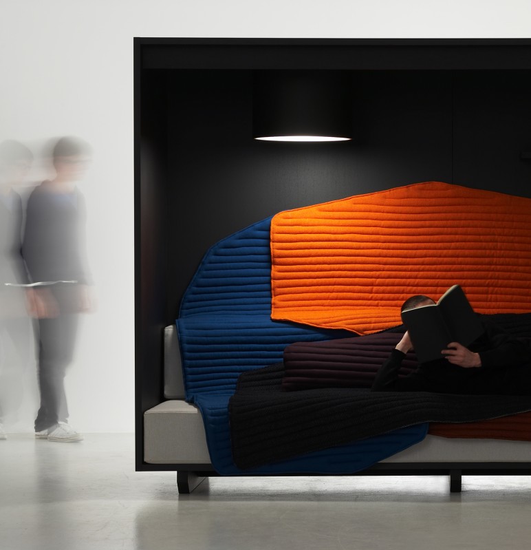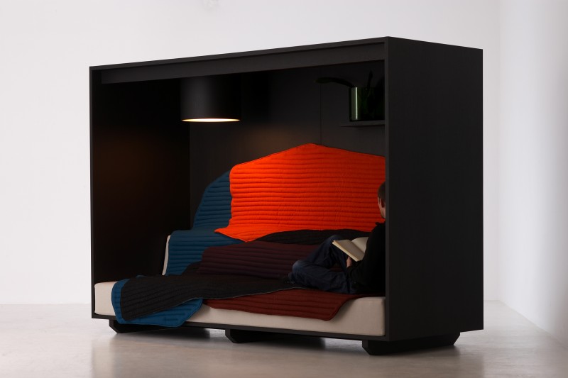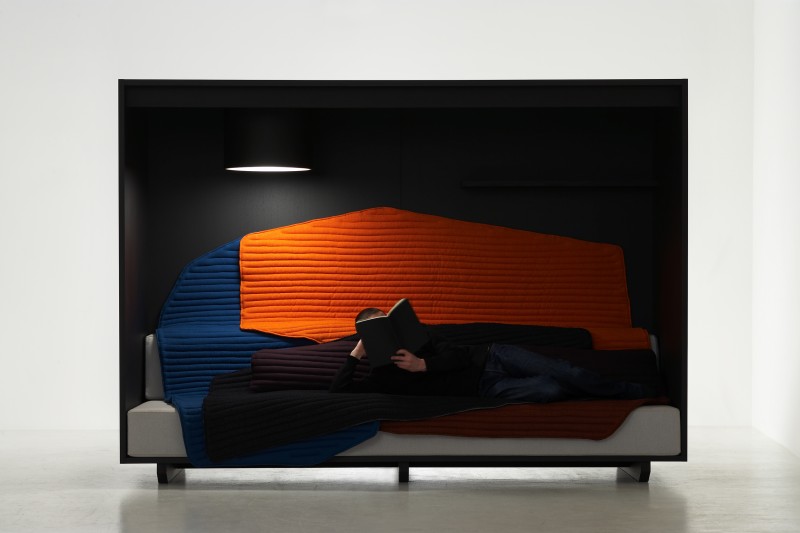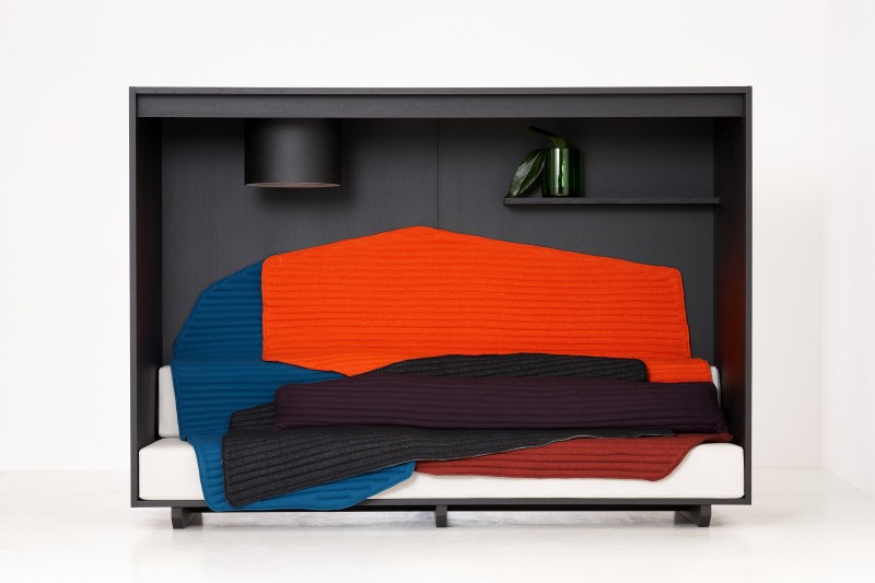 The sofa – can we still refer to it as such ? – is a black box, one of the elementary shapes that Ronan et Erwan Bouroullec love so much. The intriguing shape (3m x 2m) makes us wonder about the true nature of the object. Is it a piece of furniture or an alcove? The pile of covers clears any doubts about its function: it is a place of comfort, a shelter for rest and retreat, a sort of spatial parenthesis.