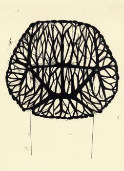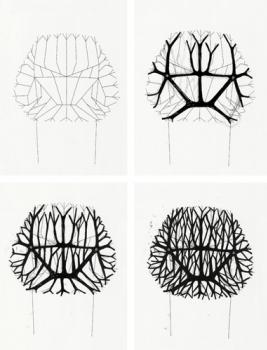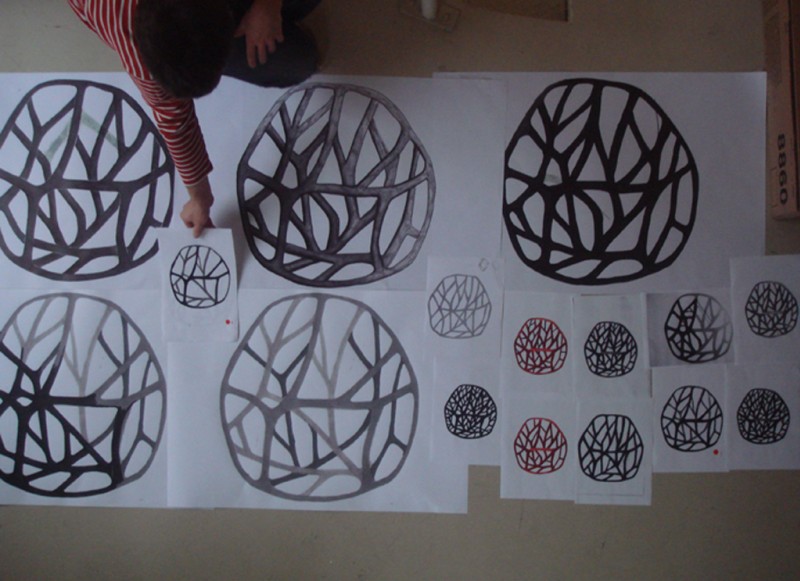 Throughout the entire duration of the project, the only way of conducting an in-depth study into industrial feasibility was to represent the chair by means of our virtual modelling software, that is, an orthonormal digital script, which represents an obstacle to the refined chaos of the organic. Resorting to this working method, which consists of moving on from a drawing to three-dimensional representation, is unremitting. Here, we found a subterfuge: having produced drawings by hand on large sheets of paper on a ı:ı scale, these two-dimensional designs were projected onto the surface of a shell. On the seat and the back, this worked fairly well, as the drawing of the branches does not move too much. Instead, there was serious distortion on the slope of the armrests. Like an anamorphosis. The distortion of the design, when applied to the form in three dimensions, was a real surprise. The branches had to be redesigned. But the real difficulty lay in retaining their spontaneous aspect. The great ambiguity of this project was to make the very sophisticated technique demanded by plastic injection moulding cohabit with a necessary poetry that can only be obtained through the sensitivity of drawing by hand.