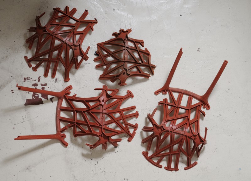 One of the important stages in the process consisted in transforming the branch sections, circular at the outset, into a T-profile. This solution gives better structural qualities whilst at the same time meeting the demands of injection fluidity. As luck would have it, it turned out that this solution reinforced the plant-like aspect of the whole piece.