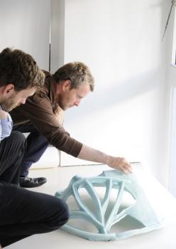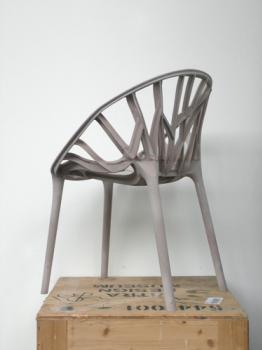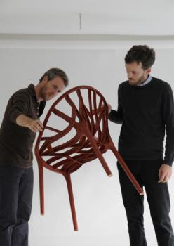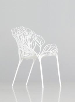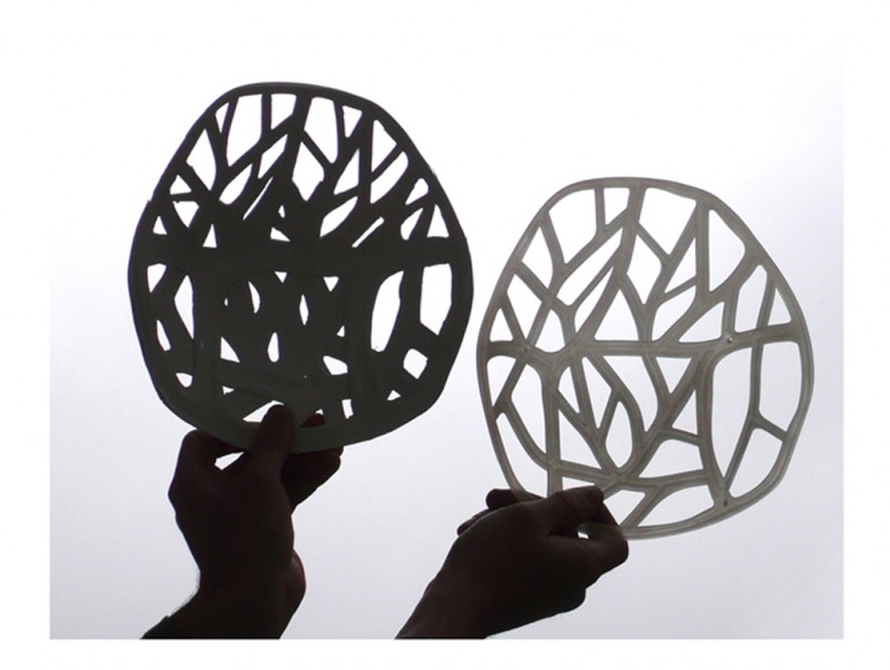 The main issue was to follow the realistic geometry of a chair, whilst at the same time using the principles of plant-like branching as a construction model. What we felt was possible in order to maintain the integrity of our proposed design was approached in stages, whilst asking questions about its compatibility with the manufacturing process. Take Algues for example, developed by Vitra in 2004. Its branching form was shown to be particularly suited to the requirements of plastic injection moulding. This process consists of injecting the liquid material, under very high pressure, into a steel mould. Just like the sap in a tree trunk, it has to circulate evenly inside all the branches of the mould, congeal and then solidify — and all in less than two minutes, at the end of which the piece is extracted. The major difficulty with this process resides in the alchemy which has to take place between the material, how quickly it moves, the fall in its temperature and its method of solidification. In other words, there is a certain number of uncertainties to grasp, given that the result must be perfectly uniform.