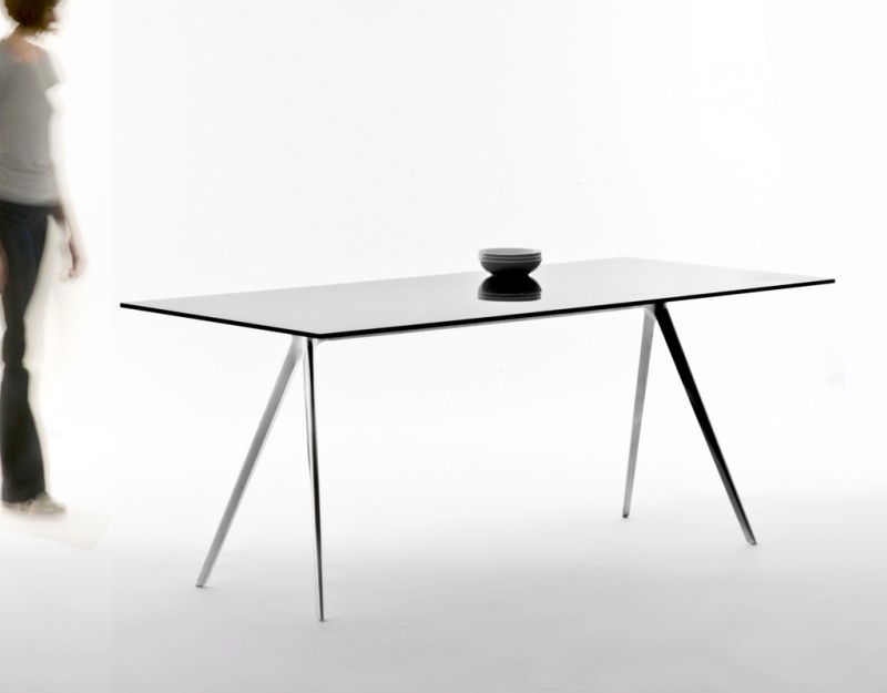 Baguettes is a rectangular, large table in two parts. An opaque top rests on a highly resistant yet delicate aluminium base. We focused our attention on the structure of the project to use the less aluminium material as possible. The effect is visual as it brings an additional graphical feature to the table: the heavy top is only supported by four chopstick-looking feet.