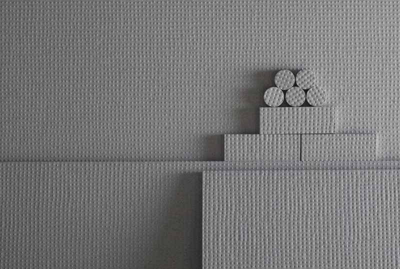 In this collection we have worked on defining a regular-irregular texture, the result is the declension of two relief surfaces: “Down” with sunken dots and “Up” with elevated dots. Both reliefs are available in their natural, monochrome base colours: “blanc”, “gris” and “terre”. Furthermore, to add dynamics, we also decided to use two tones of colour, red and blue, applied as little dots in the hollow or as a base colour. The use of colours activates the relief by creating delicate shadows, turning the tiles a nuance colder or warmer.
