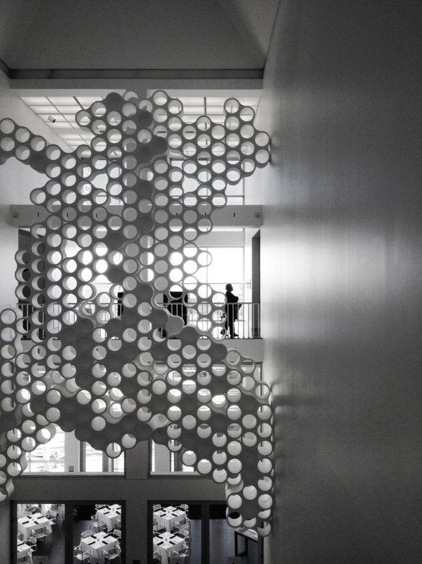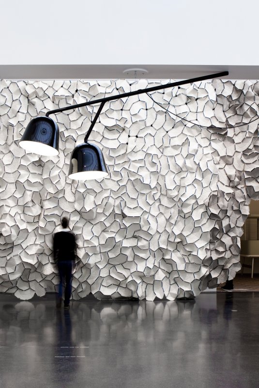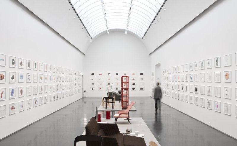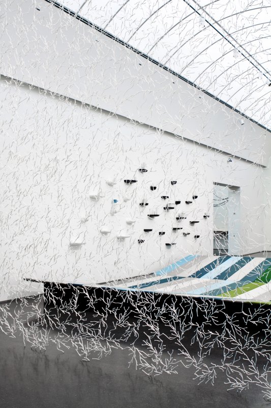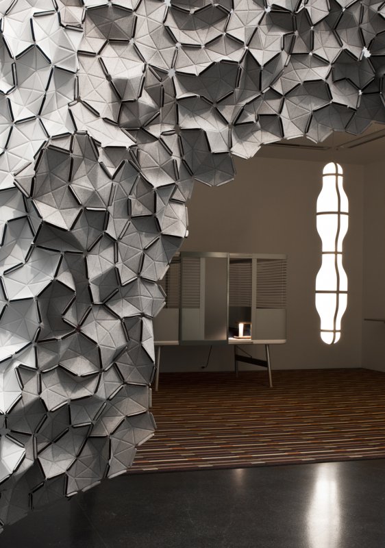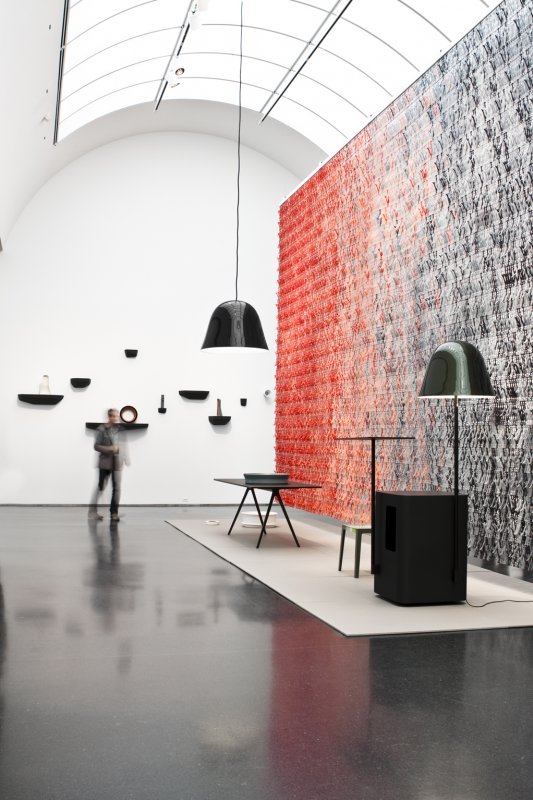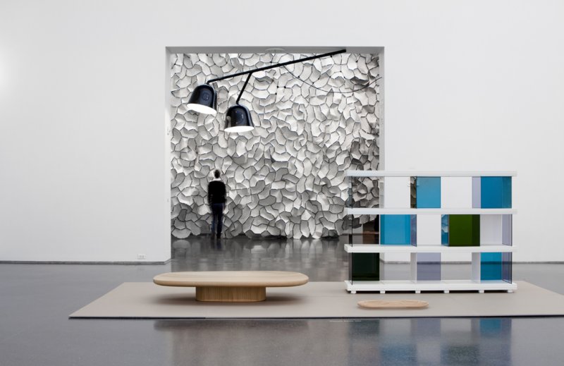 Many of the Bouroullecs’ products can be described as “microarchitecture”—items larger than furniture but smaller than architecture. Their award-winning Algues are molded plastic branches that can be snapped together to make translucent and organic screens. Their pressed felt Clouds can be slotted together to make multifaceted, colorful walls or enclosures. In Bivouac, the MCA galleries are enlivened and divided by these products, including specially designed pedestals on which the brothers’ smaller-scale works are displayed. This signature approach to interior space creates a rich and immersive environment in which to view objects large and small from across their career.