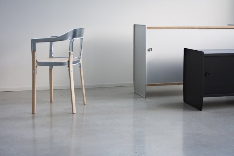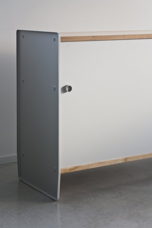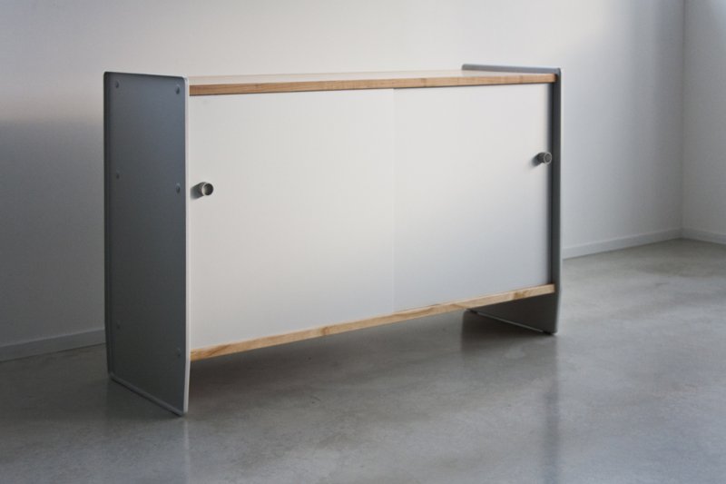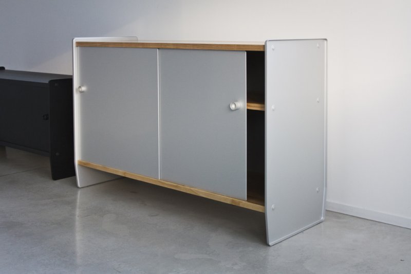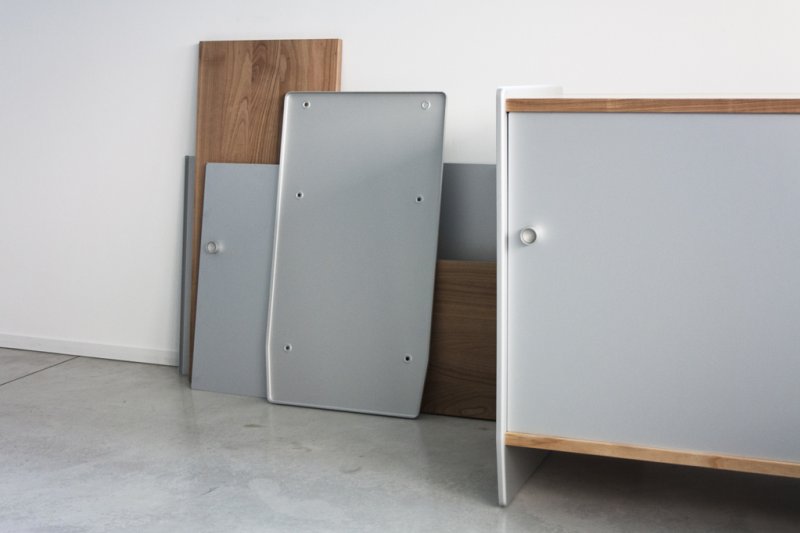 The body frame of the sideboard is composed of stamped aluminium sides and solid wooden shelves, the back and the sliding doors are made of cut and bent aluminium. The construction is simple – visible screws fix the solid wooden boards to the punched aluminium sides.