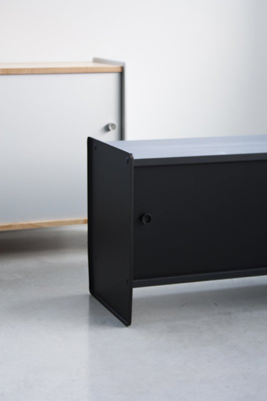 We find fascination in turning a thin sheet of metal into a rigid structural piece with a single considerable punch – but even more are we fascinated by the challenge of creating domestic, pleasant objects with a technology usually used for industrial parts. The very basic typology of the Theca sideboard can be found in all