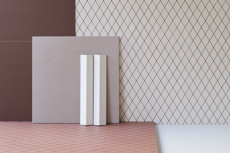 Carré, 40x40 rectified slabs in glazed porcelain stoneware, are produced on a mould made of many little embossing diamonds on a matt surface which gives a strong ceramic identity to the collection. Carré is available in two versions: Uni, where colour is evenly distributed throughout the whole slab, and Light, where colour is used to underline the white diamonds outlines.