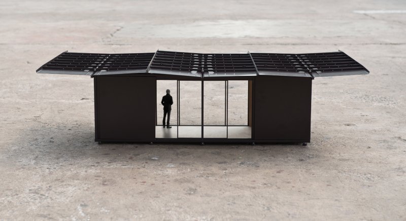 with a broad roof that amply overhangs the wall, creating a sheltered external terrace illuminated by hanging lamps. The roof can fold into itself in two-panel sections, which can then be stacked and moved in a trailer.