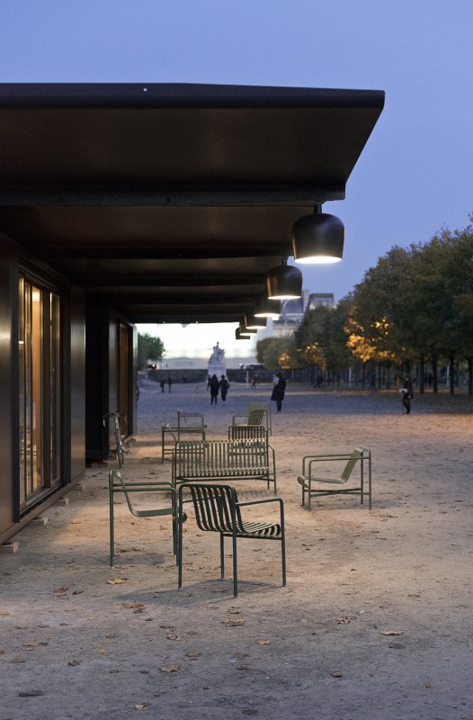 The construction, manufactured by the Ateliers of La Machine in Nantes, was built like an urban furniture : the pavilions can be easily transported inside a truck and assembled in three hours.