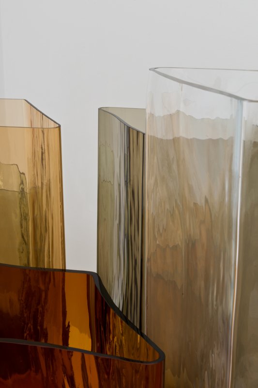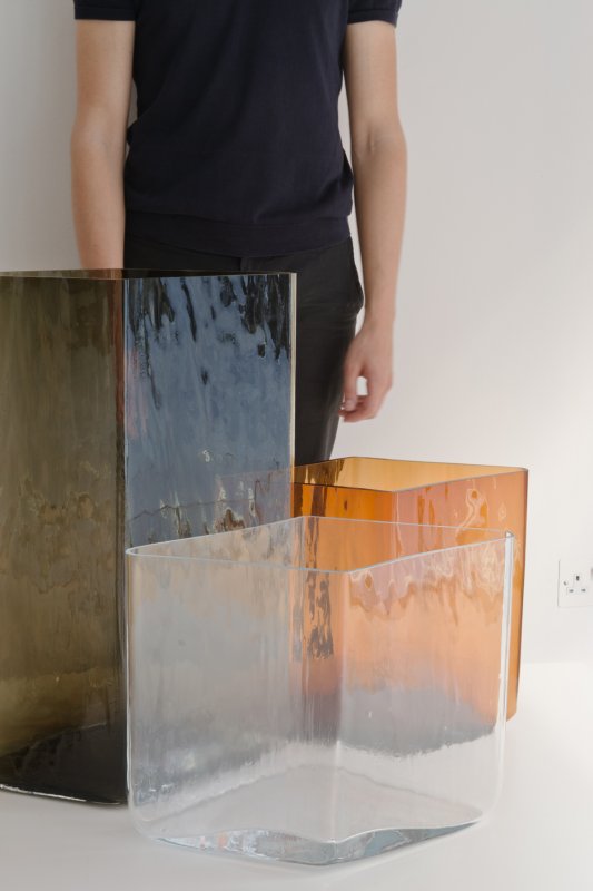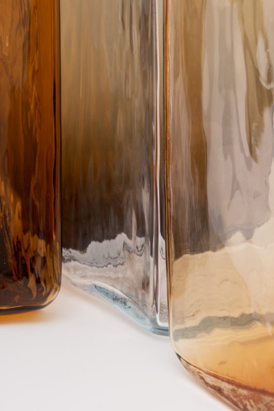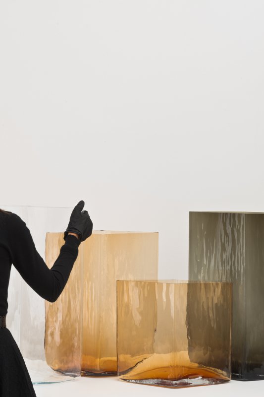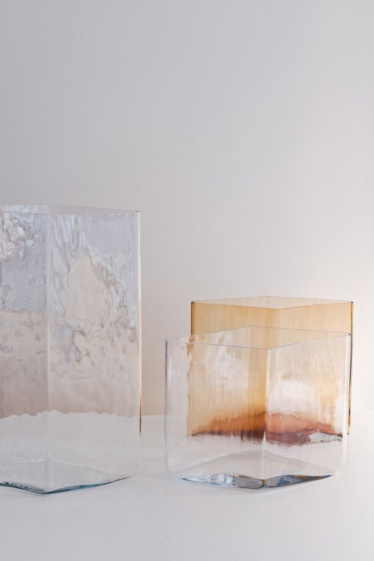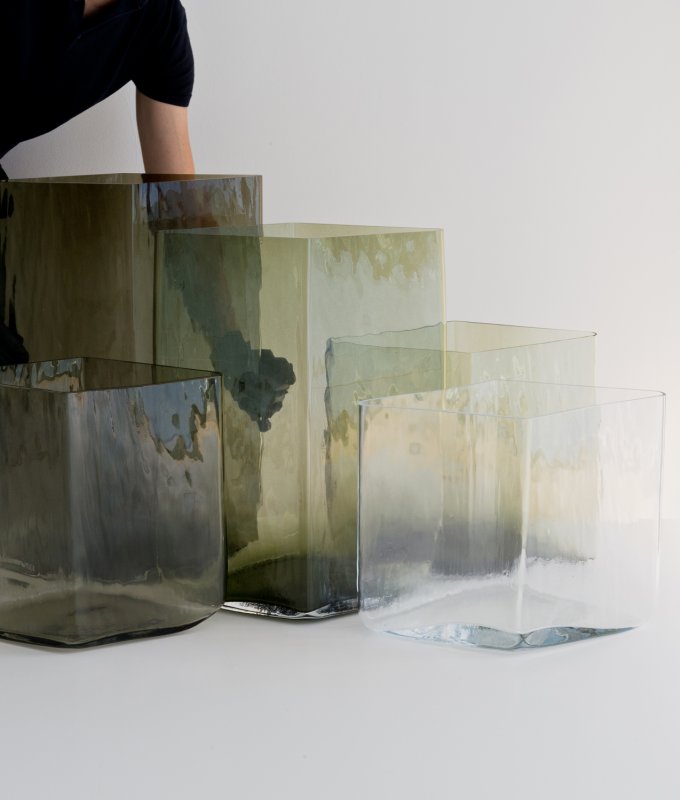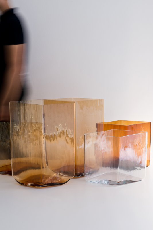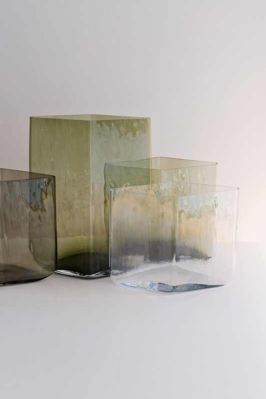 Their diamond shape and considerable sizes (from 35 to 62 cm) challenge the material to its limits and unveil the highest level of Iittala's glas-blowing expertise. The fluidity and vibrant feel of the mouth-blown glass is highlighted by the use of wooden molds.