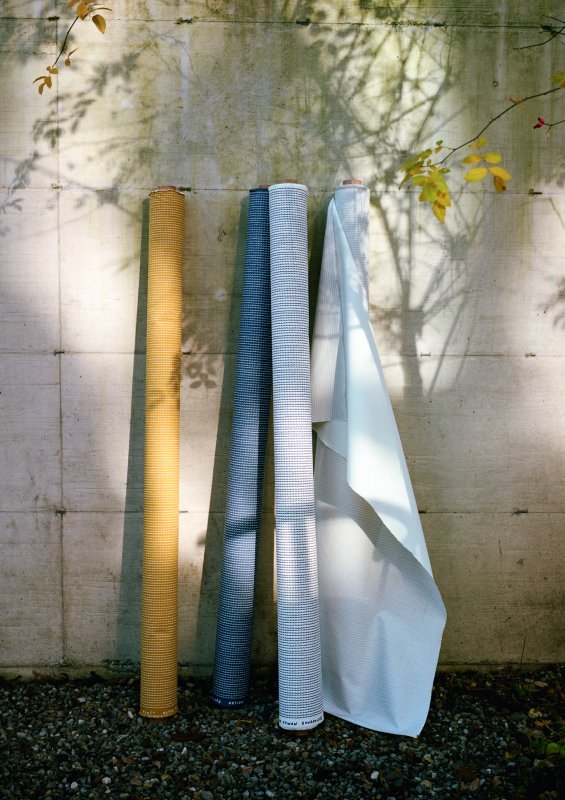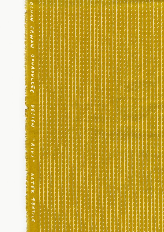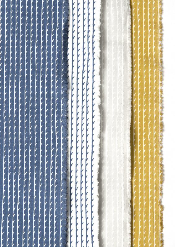 The Rivi range consists of four colored fabrics: white/blue, blue/white, mustard/white and light grey/white.