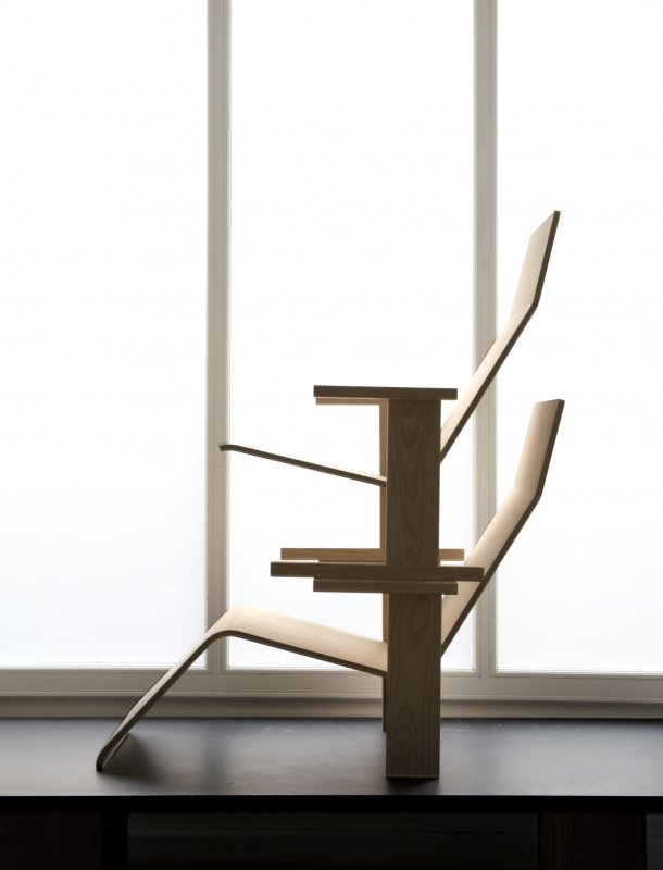 While the first two collaborations explored the rather computerized manufacturing posibilities of Mattiazzi, Quindici is constructed in a more direct and traditional manner. The plywood backrest and plywood seat are held together by a central wooden bridge. The sides and armrests are build up of wooden planks.