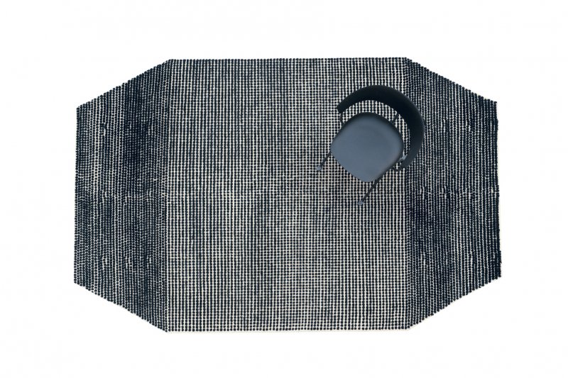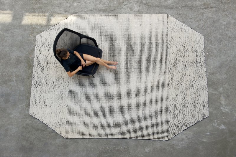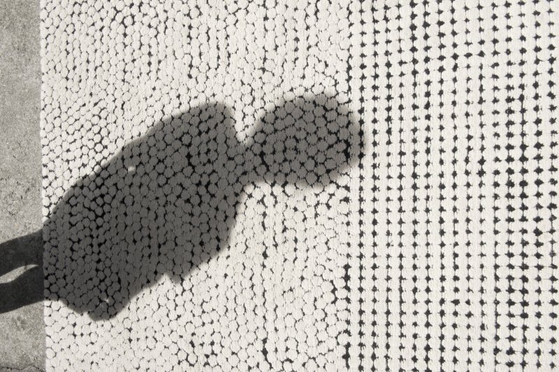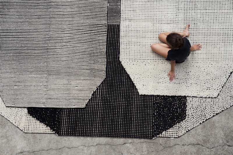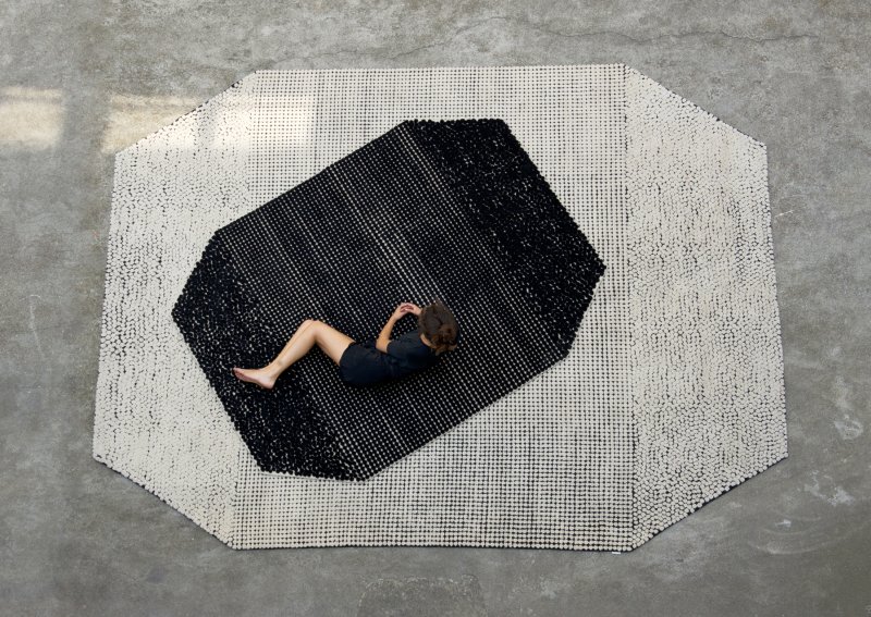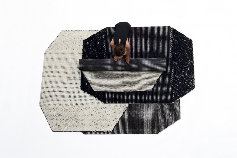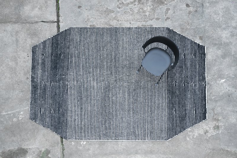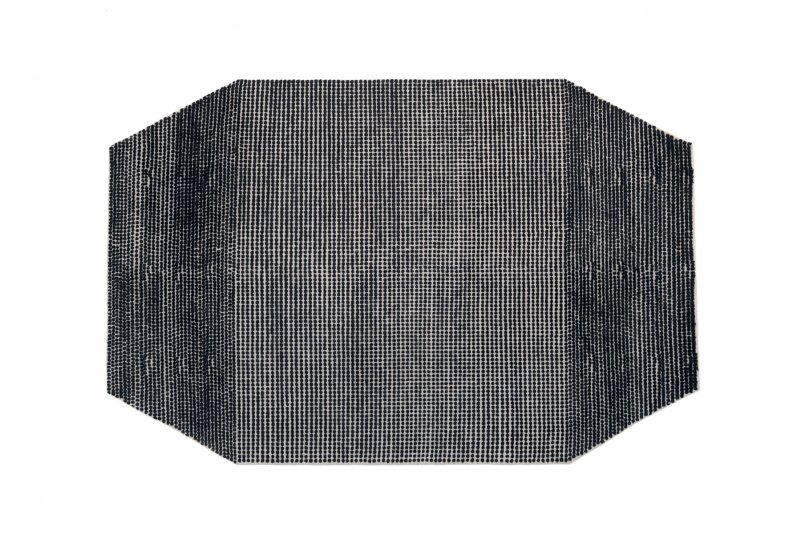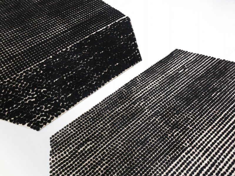 There are two designs available, one featuring small dots and the other large dots, and there is a choice of two colourways, black and white in both positive and negative variations. The four rugs offer a range graduating from predominantly black to a mostly white surface.