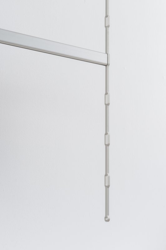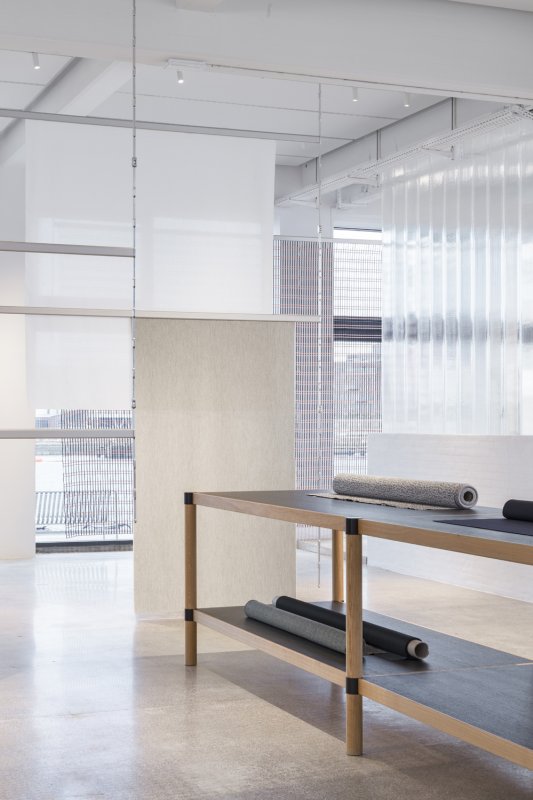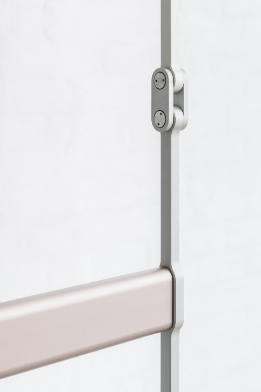Next to the large skeleton, the main work has been concentrated into a number of parts made to hang fabric into the space. They are vertical elements that connect to a ceiling grid, onto which rails attach to unroll the textile. The system turned also into a large shelving, using most of the same elements, in combination with really boards for the plates. Most of those elements are made of raw and anodized milled aluminium parts. They were carefully engineered to make sure they would be versatile, and provoke action. Kvadrat has the freedom to permanently change the nature of the space, but it’s also their burden.