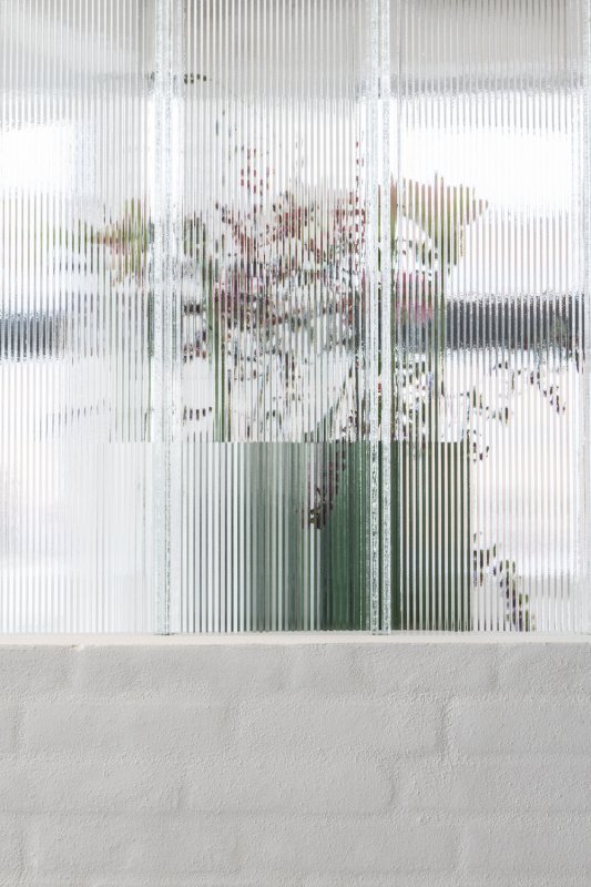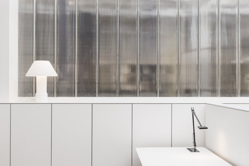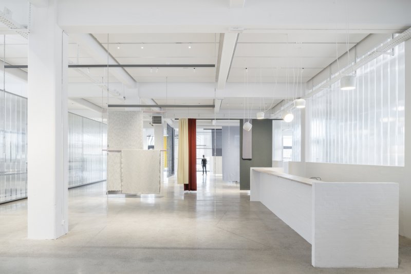 The showroom is located in the harbor of Copenhagen, a former building that was used to unload cargo. It has a very strong character, heavy old concrete, and large views to the water. Light is dominant, and moreover the feeling of the outside such as wind, rains, clouds, enters through the large openings. So since the beginning, transparency was key. We have been building walls out of brick and edgy extruded glass profiles. The brick walls connect to the concrete, they are heavy but they also have a richness of texture. The extruded glass profiles collect the light, and create an ever changing atmosphere depending of the weather outside.