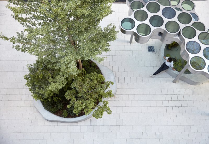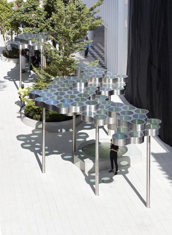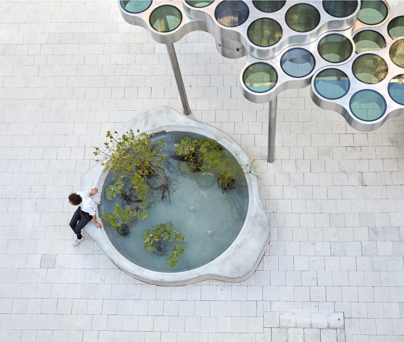 Quickly, vines will colonize the system, gaining depth and patina throughout the years, encircling the quiet ponds and plant beds arranged along the path. These freely shaped concrete forms emerge as if from the ground, mineral and heavy. They contrast the stainless-steel roof on which the environment, the sky, the vegetation are reflected. The reflection resonates with the changes of day, with the seasons, inviting relaxation, reflection, and respite from Miami's bright sun.