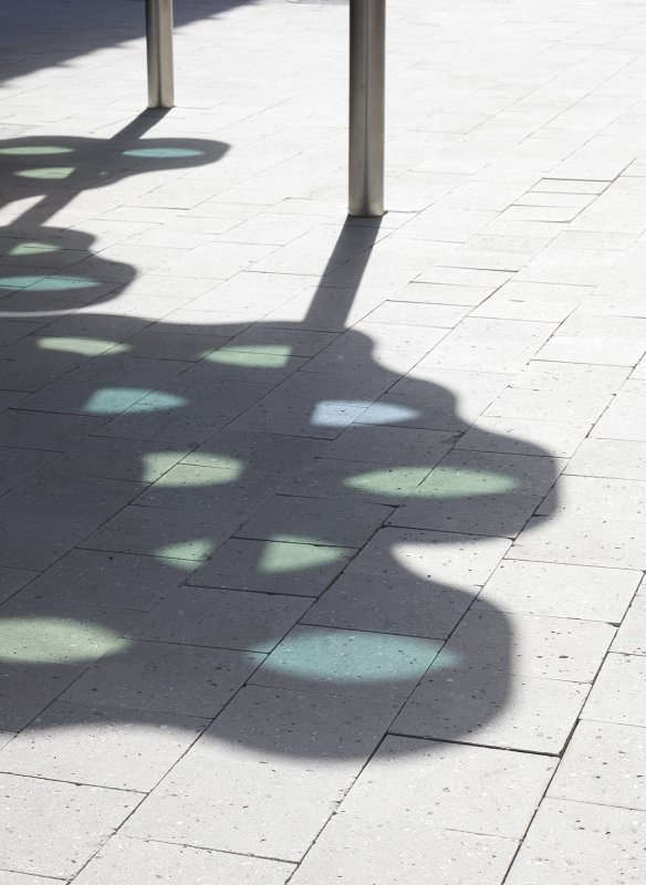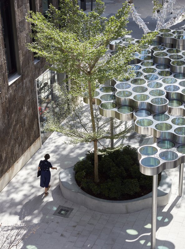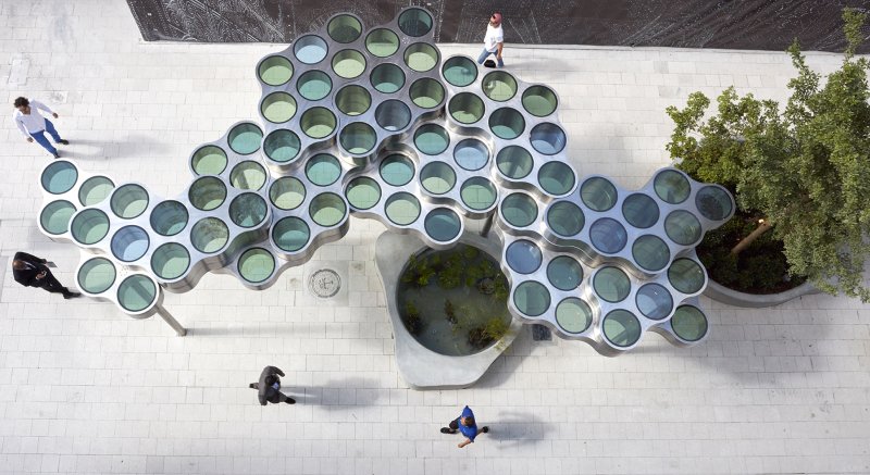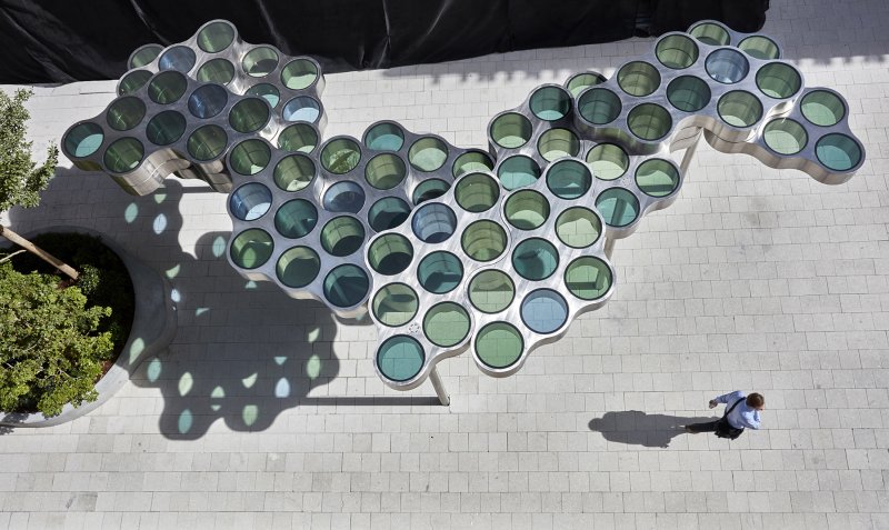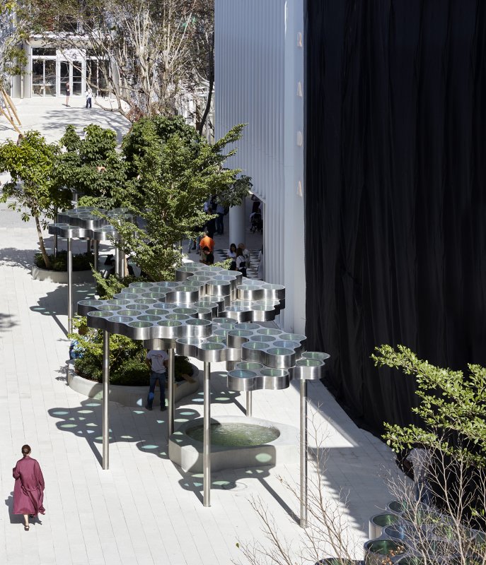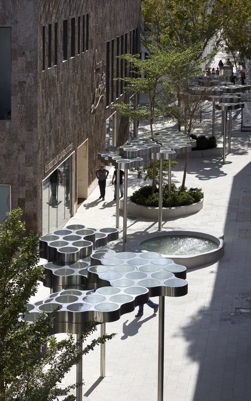 Nuage promenade is a 100 metre-long urban design.The modules and columns are made of stainless steel and tinted glass. The ground elements, ponds, planters and seating areas are made of raw concrete.