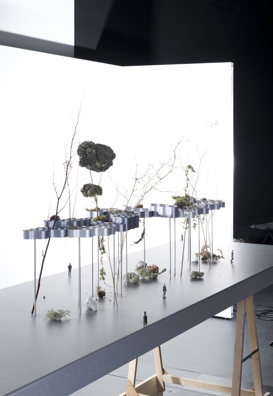 ored glass structure that mimics cloud apertures, casting graphic shadows that vibrate with blues and greens like stained-glass windows crossed by the sun in cathedrals. Local rustic plants envelop the project, with trees jutting through the clouds to the sky, or relaxing against them.