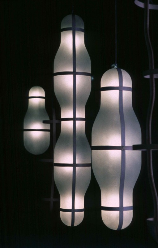 « The « Objets Lumineux » are big lamps, formed from a plywood skeleton which supports two half-shells of translucent thermoform plastic. These shells diffract the light, softening and diffusing it in all directions. There’s this idea that technology should be invisible. Electronics follows the dogma of miniaturization, and you often expect this disappearance of technological objects towards a more immaterial use. Perhaps the oversized lamps were reacting to this myth. Giving them a human s
