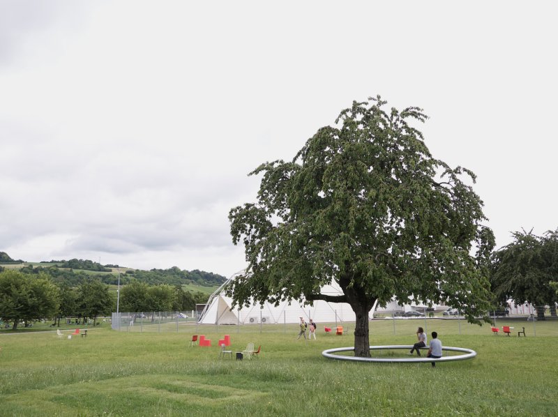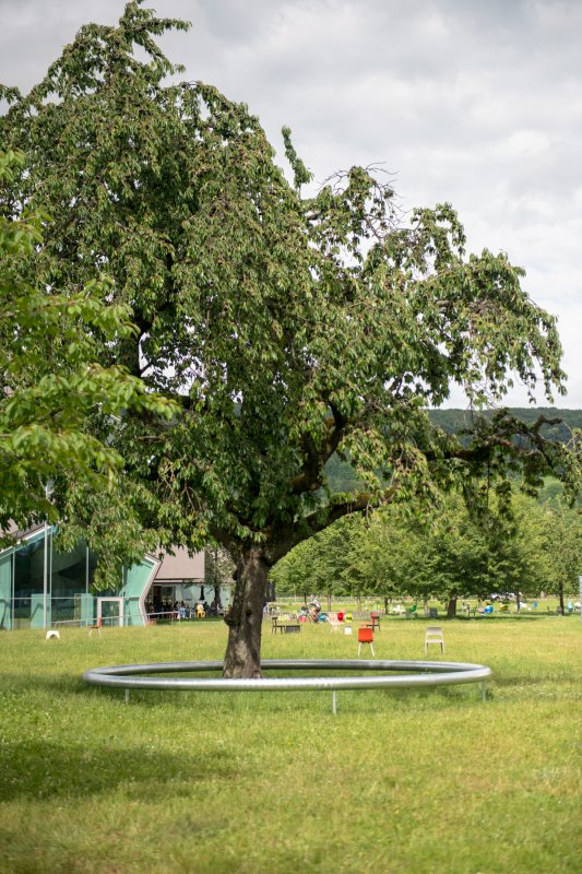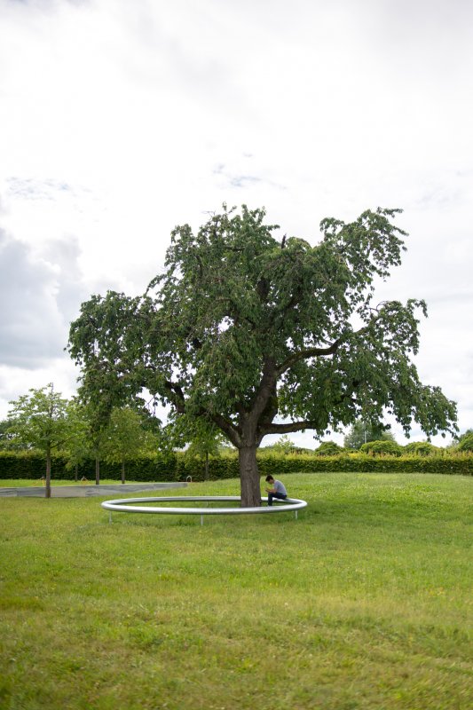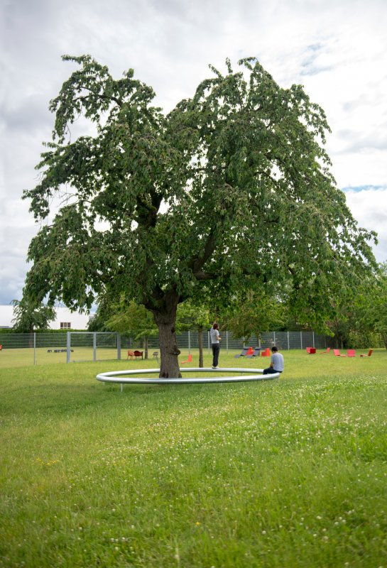 Ring is a circular platform made of galvanised steel, which appears to float above the ground. Encircling a cherry tree, it serves as collective bench.