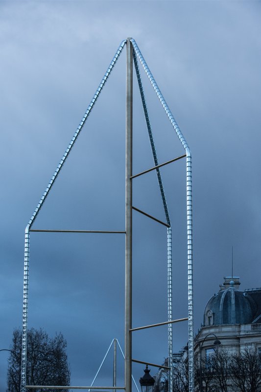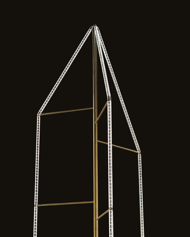 These fountains, erected in six basins, interweave water, light and movement and restore the symmetry of the site. Each structure consists of a 13m-high central mast in bronze, which supports a series of crystal light hangings through which the water flows and falls.