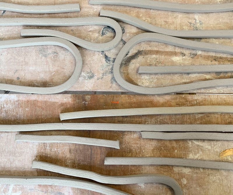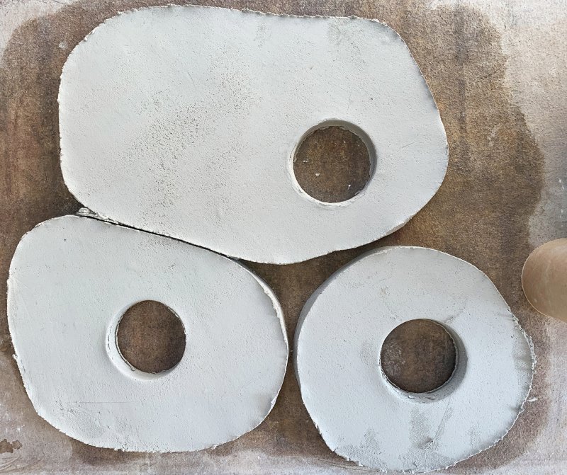 Each shape is cut from a slab of clay. Some fit inside the cylinders. Others are slotted over them.