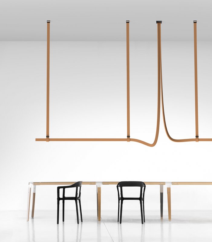 The best position for a light source is always unexpected, also its connection to the electrical source. Following the same approach that AIM has proven true, Belt is flexibility, so its nature is a balance between soft and rigid. The soft element are the connection sections, the rigid parts are the light source, long LED beam. Belt is a line that can progress endlessly.