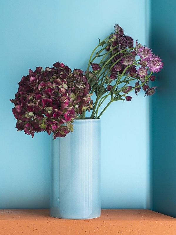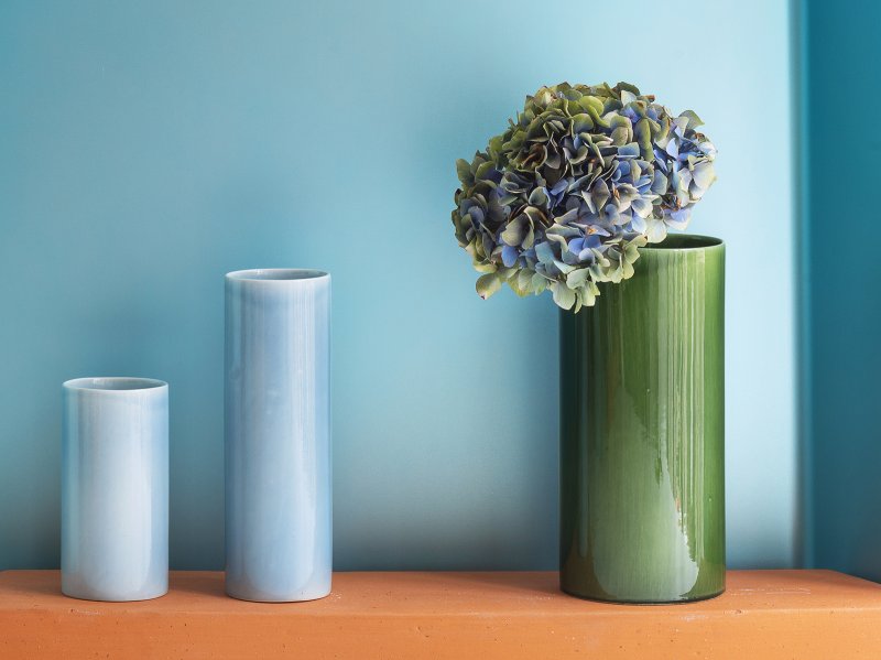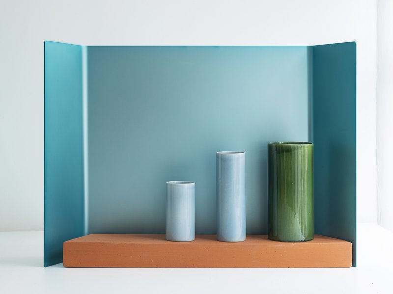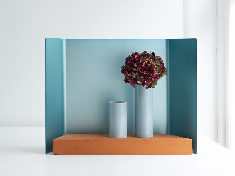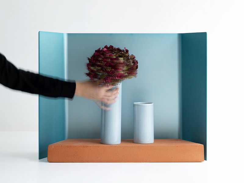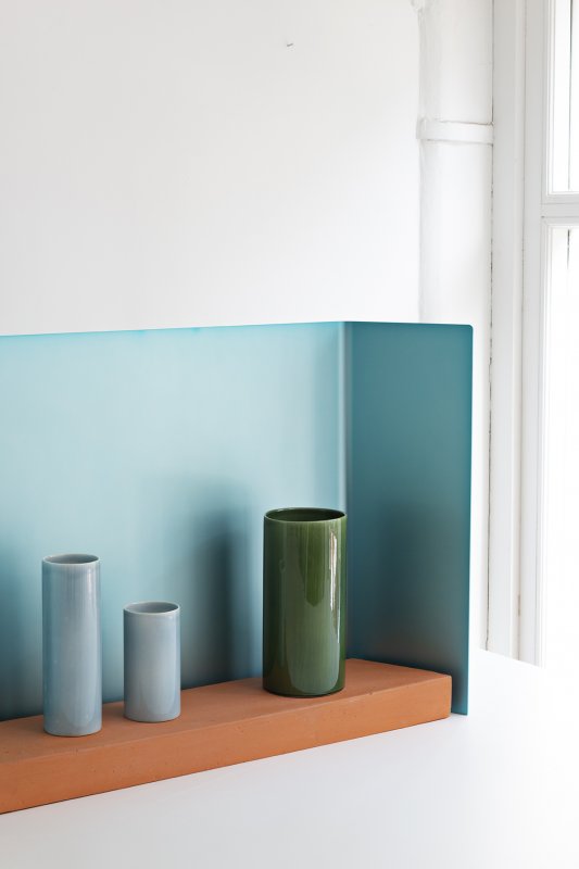 The anodized aluminum plaque, vibrating in the light, becomes an azure sky. The lip of the window takes the form of a terracotta brick. The enamelled ceramic cylinder perfectly accommodates fresh f