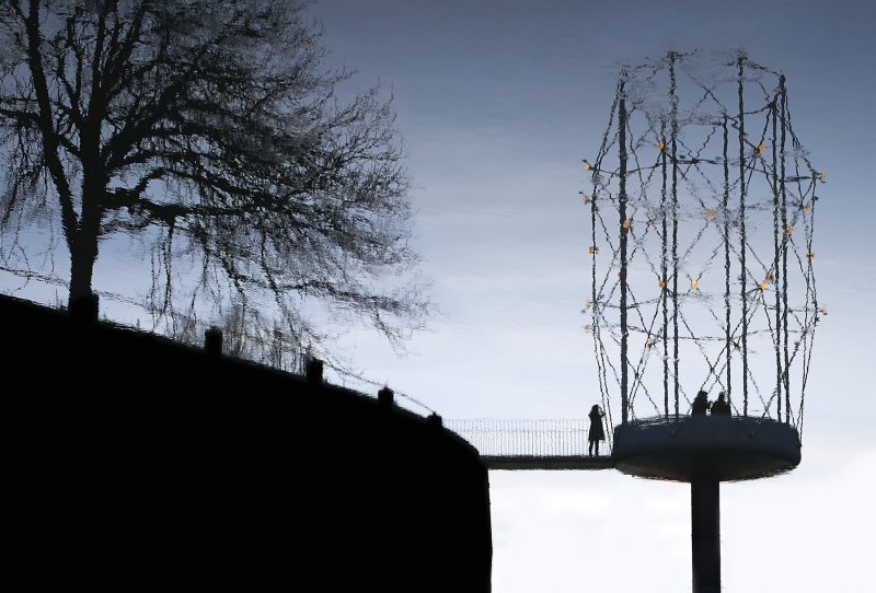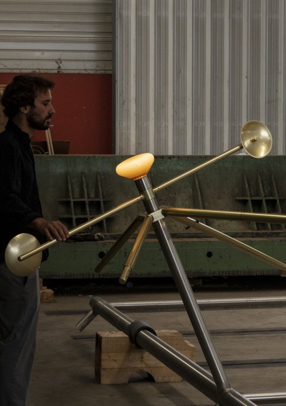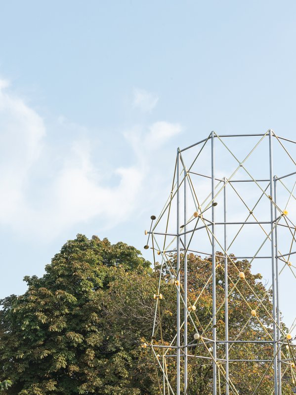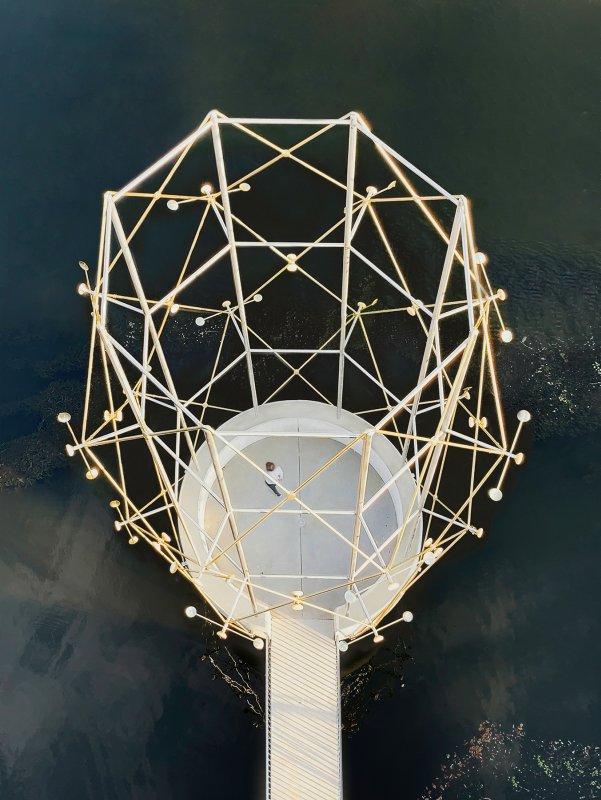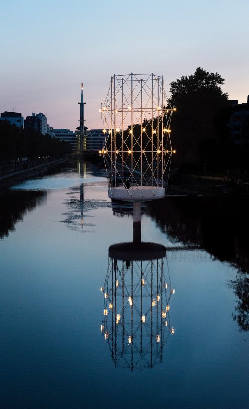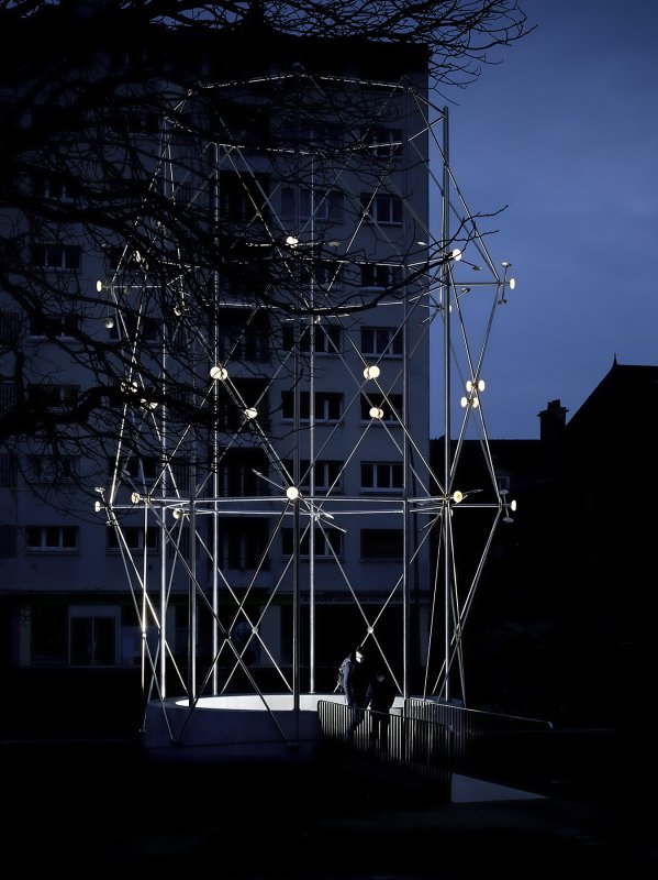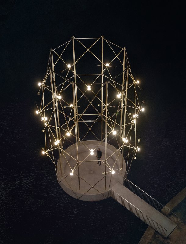 Like most objects designed by Ronan and Erwan Bouroullec, the Belvedere is striking in its simplicity of form. Sitting on a pile planted in the Vilaine, the Belvedere is composed of a circular platform in unpolished concrete, crowned with a lightweight, slender structure (13m high), giving the impression of a sort of pavilion or bandstand. This structure – a tensile assembly of stainless-steel masts and anodised aluminium stays – holds 32 luminous orbs and 16 wind-sensitive mobiles, which reinforce the impression of an extraordinary object.