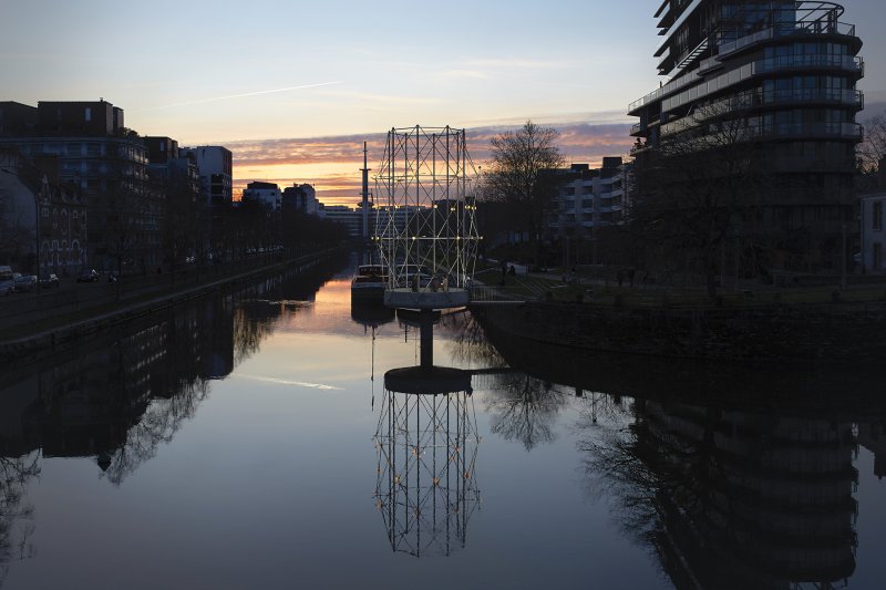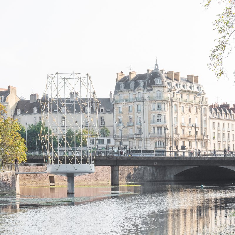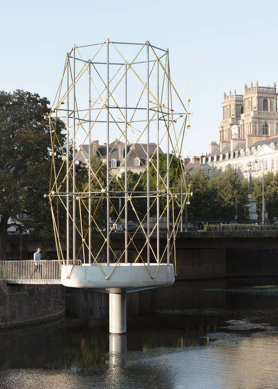 After three years of discussion, analysis and designs, Ronan and Erwan Bourroullec’s project had taken on the look of a folly – in the sense of one of those small constructions that appeared in the parks and gardens of the 18th century, little buildings that served no specific purpose other than to satisfy a fancy. In Rennes, Ronan and Erwan Bouroullec’s folly is a ‘Belvedere’, standing in the River Vilaine in a position remarkable for the quality of its urban design (the Mail area designed by Alexandre Chemetoff, the pedestrian avenue of the Mail François Mitterand, and the Confluence gardens) and some notable architecture (Jean Nouvel’s Cap Mail, Louis Attetche’s Mabilais, and the forthcoming Landscaped Ascension by MVRDV and Barré-Lambot’s Inside).
