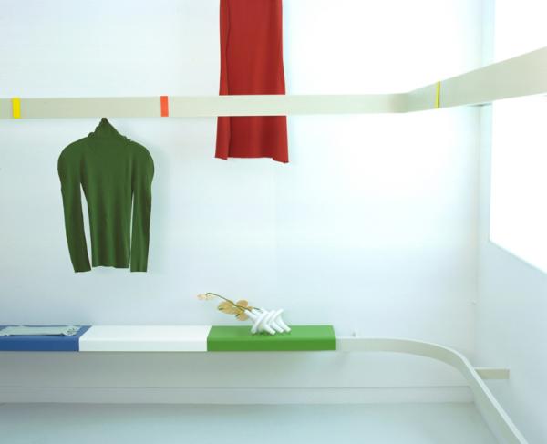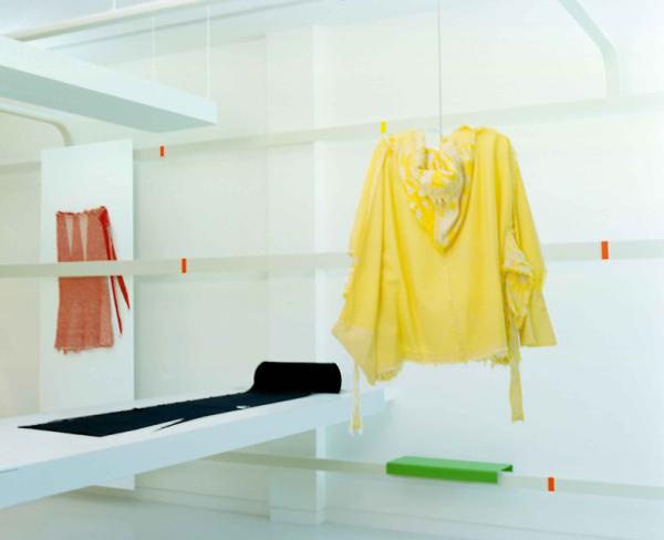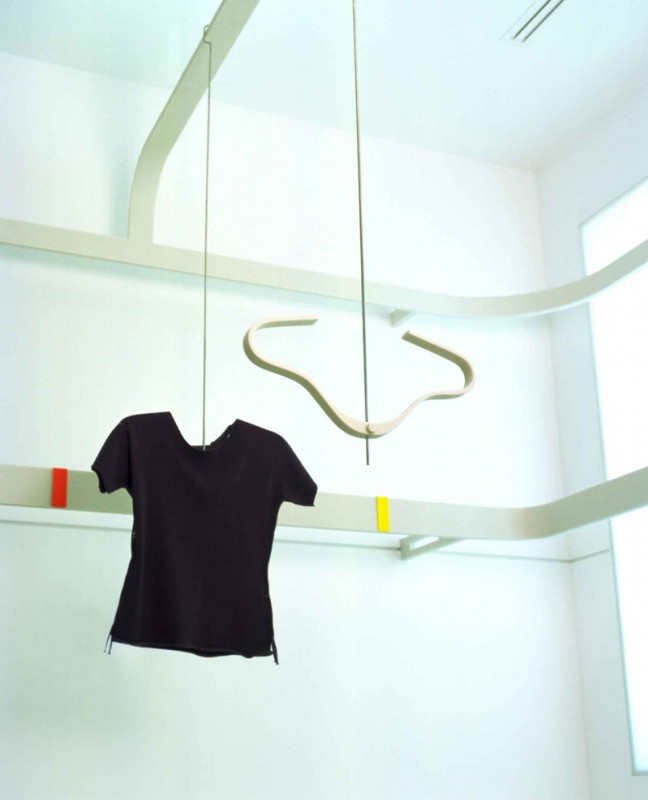 y serve to carry the clothes on hangers. The heads of the hangers are hidden at the back of the bar. Then, a series of accessories, which are also placed on the framework, allows you to arrange other elements in a different way: big vertical metal plaques act as boards to which the clothes have been attached with magnets; horizontal plates hold clothes laid out flat, and also shoes or bags. Finally a play of little coloured plaques enables a form of punctuatation for the whole arrangement, allowing a distinction between the different ranges.
