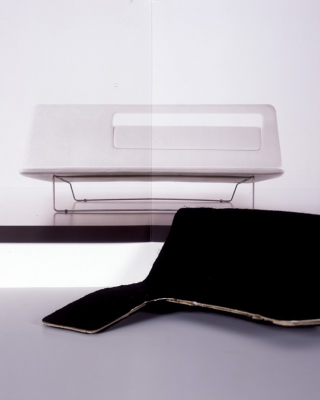 “The « Glide » sofa is harder to appreciate; at first glance it seems to be overly designed. In fact it combines a number of functions, as though it had contracted within itself a living room situation: a little set of shelves, a sofa, a chaise longue. A classic typology is supplemented by its close referents, in return for extra room and a certain fluidity of behaviour.”