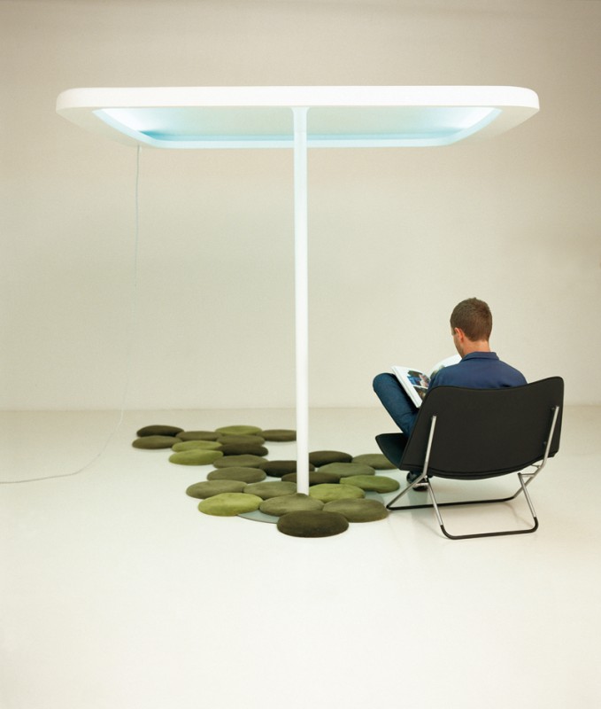 « The « Parasol Lumineux » lamp attracts people just as a hearth does when you walk into a home. The feeling of finding yourself below a roof, which is itself below a ceiling, attracts and brings people a greater intimacy. The space is created by an immaterial context, connected with that sense of ‘being below’. “