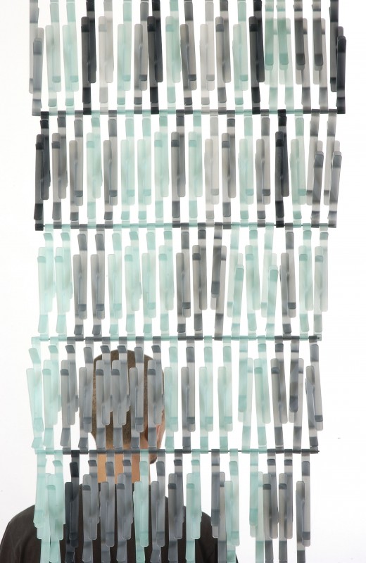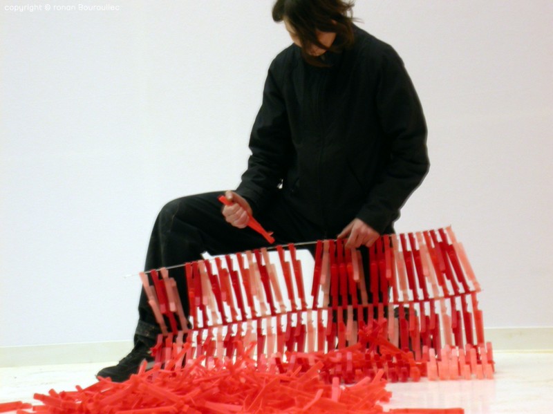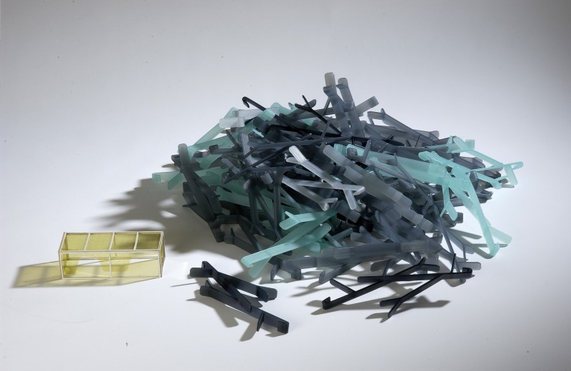 “The project of a wall for a shelter is based on the multiplication of a tiny three-dimensional motif. This piece, which resembles a small branch, is injected in polypropylene. Simply, with different colours and various alternate connections, we have managed to create an irregular skin. In this instance the repetition generates a certain visual complexity.