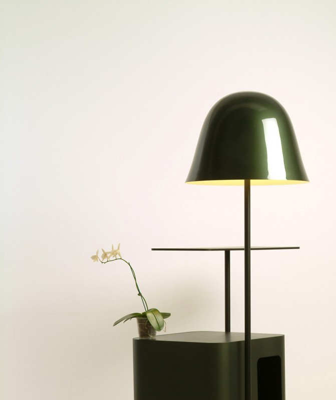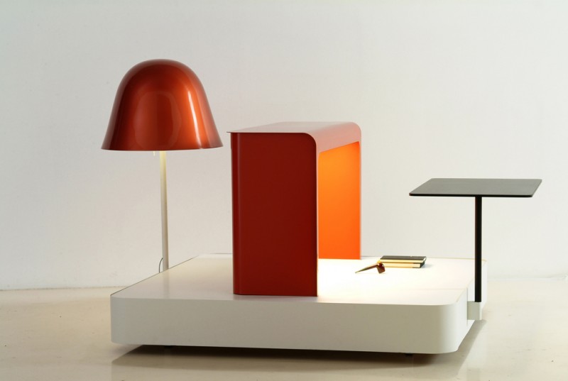 Starting from the floor, we lay a kind of "stone" or pedestal : a volume made of a metal bent, bordering a corian or leather flat surface. These "stones" exist in three dimensions, a flat long one, a little thicker square one, finally a high volume. To these bases laid by each of the "stone", we add a luminous box, a lamp, a tablet and