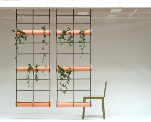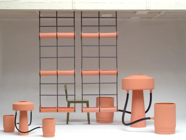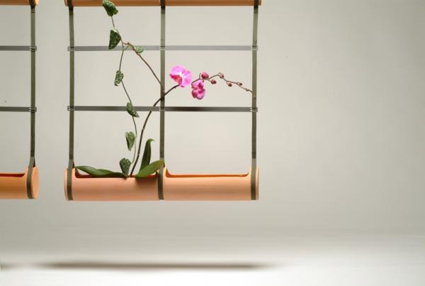 “Our flower pots try to propose solutions for plant life within the modern habitat. The fountain provides constant humidity to the three pots that it supplies with water. The « Hanging Trellis » suggests a wall of plants. Terracotta cylinders are suspended from straps, and metal crosspieces serve as supports.”