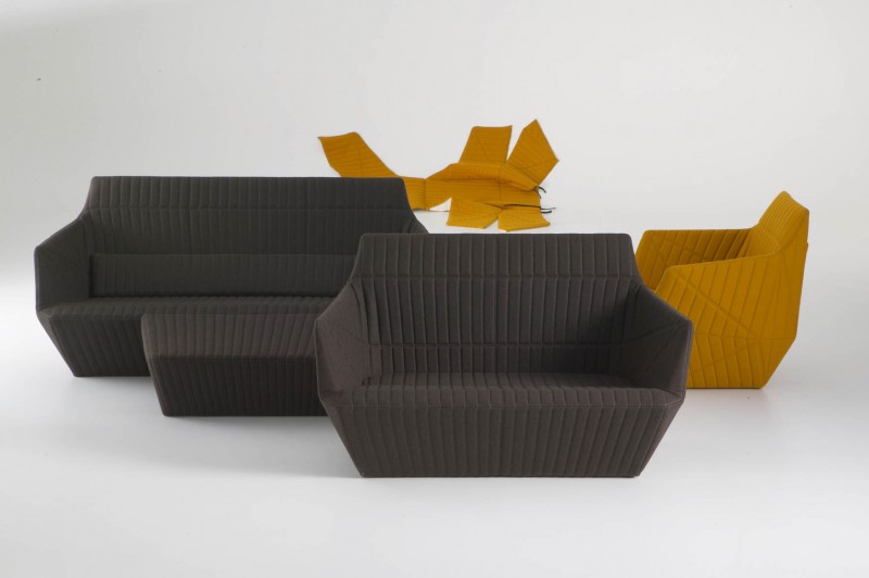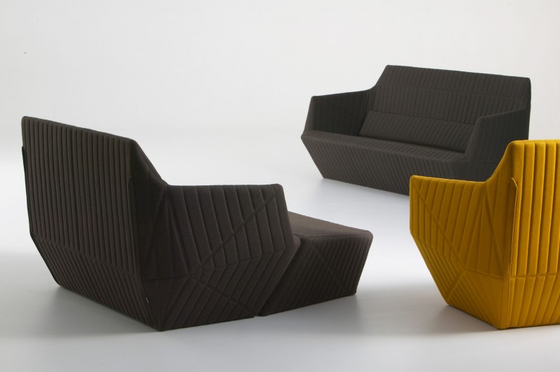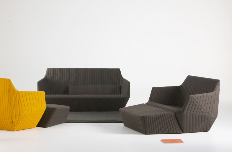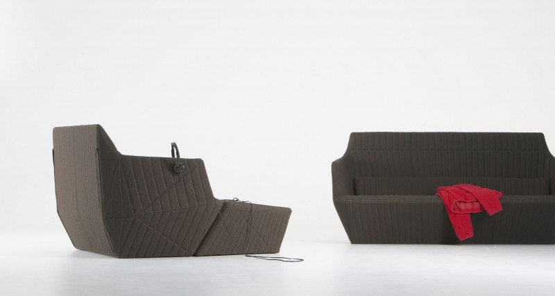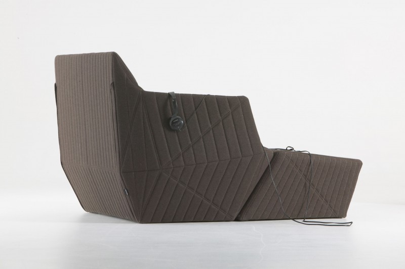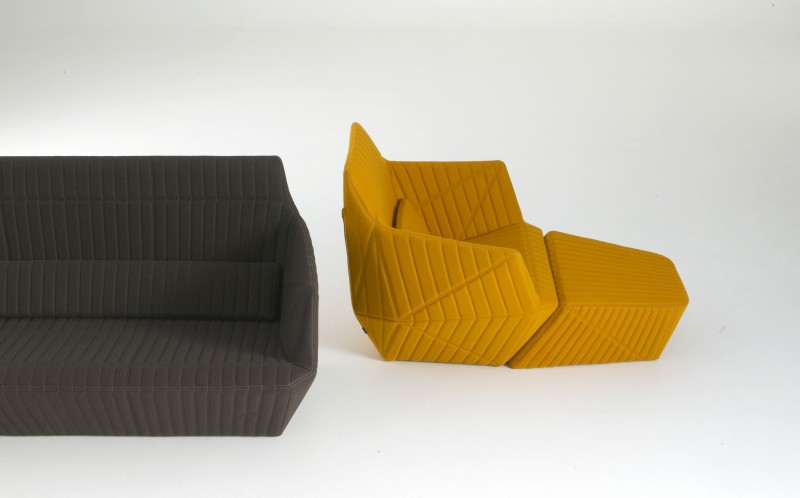 The Facett sofa is made using a digitally programmed sewing machine. The machine’s unique properties were taken into account when designing the extremely sophisticated quilted upholstery. The precision of this process makes it possible to create folds and multifaceted surfaces, much like a cut diamond or origami. A carpet and fitted footrests complete the chair, transforming it into a recliner.